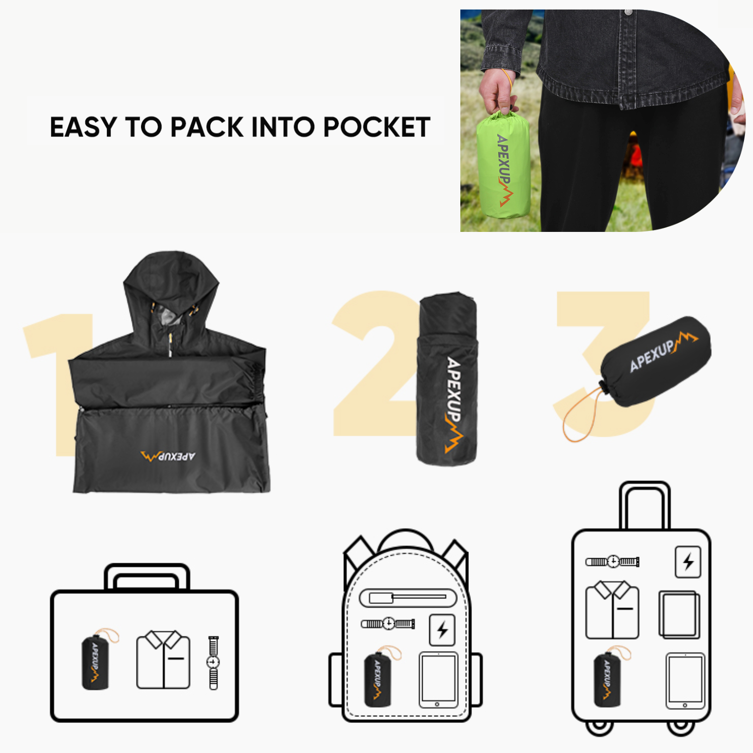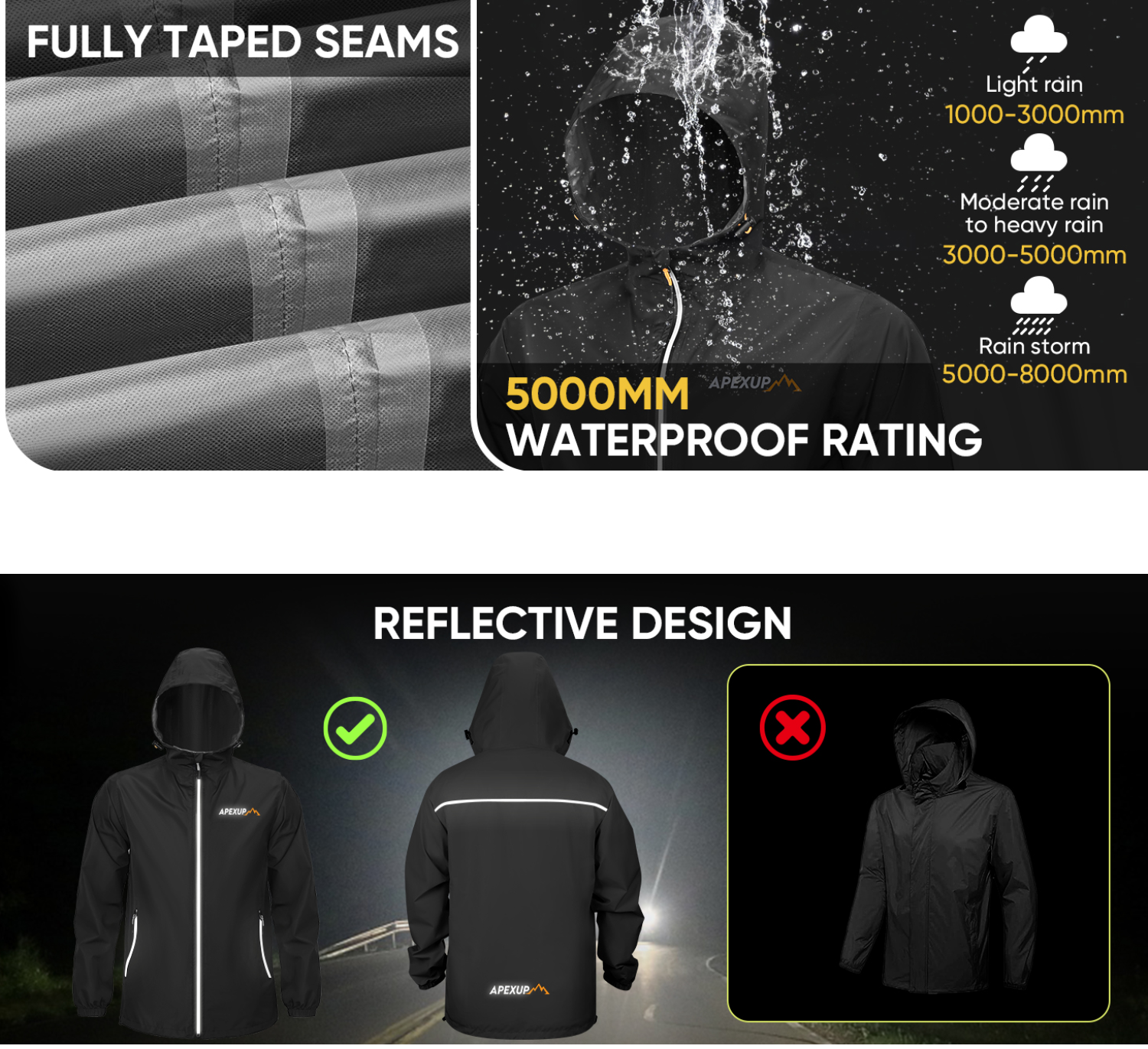 - Waterproof and Windproof: The APEXUP rain jacket is made from tear-resistant, high-density polyester with waterproof zippers; It features a premium waterproof coating and hot-pressing sealed seams, ensuring a 5000-8000mm waterproof rating to keep you dry in any weather.